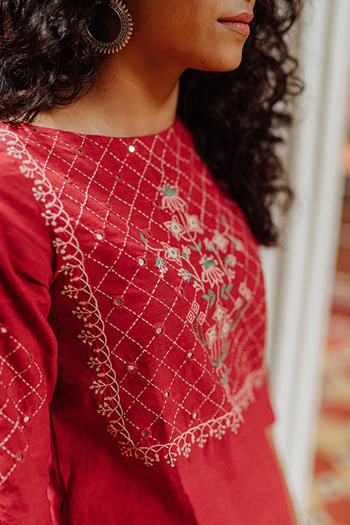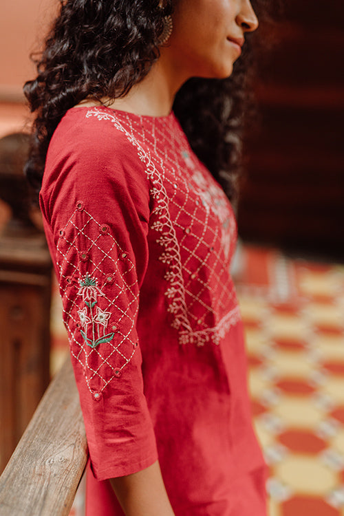 Okhai’s ‘Belle’ is an exquisite piece of clothing everyone must possess. This beauty has been made with extra love from pure cotton fabric. Intricate embroidery and mirror work on the front, the sleeves and the back make this a statement piece perfect for the festive season. Style it minimally to highlight the detailing on the kurta to ensure it gets the attention it deserves. Or go crazy with accessories to make a grand statement. Equipped with two pockets, this long kurta is a wardrobe essential. Wear it for daytime festivities and celebrate happiness.
