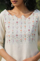 The kurta is designed with a mountain peak shaped neck line, heavily embroidered yoke in grid pattern of flower and leaf motifs and embroideries. The kurta has double knot stitch, satin stitch, closed button hole stitch, laisy daisy stitch and chain stitch to make it a trendy piece of clothing. For added glamour, the embroidery is also adorned with shimmering round mirrors in every alternate line. Not to forget the back, it features a delicately embroidered diagonal shaped motif at the back. The pant is also beautifully designed with an elastication at the back along with two roomy pockets to enhance your comfort level. Our Flourish kurta-pant can be worn for any occasion, and is ideal for summer wear because of its light fabric. Get yours today!