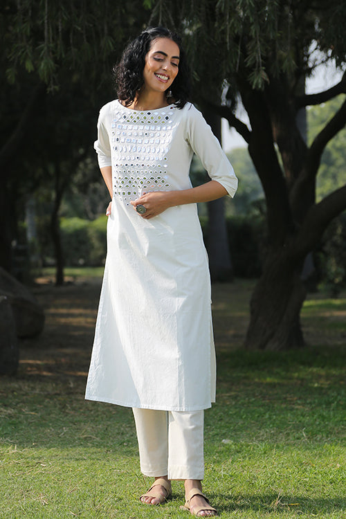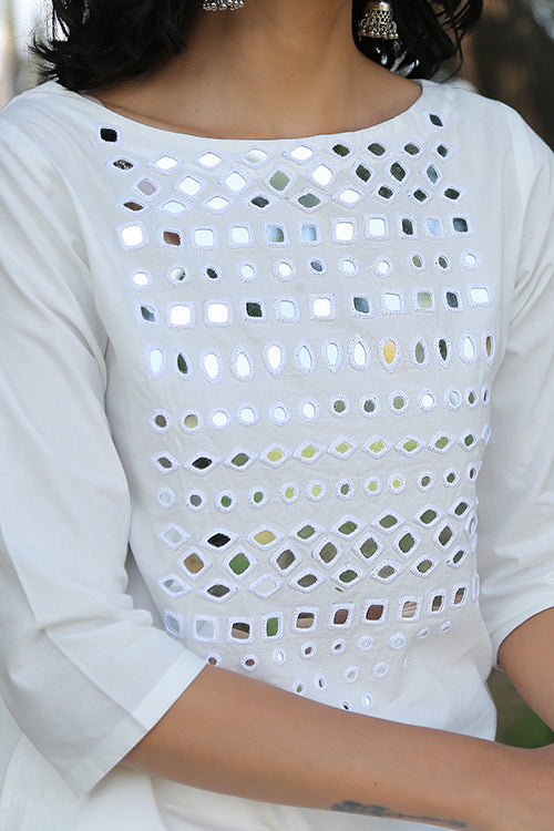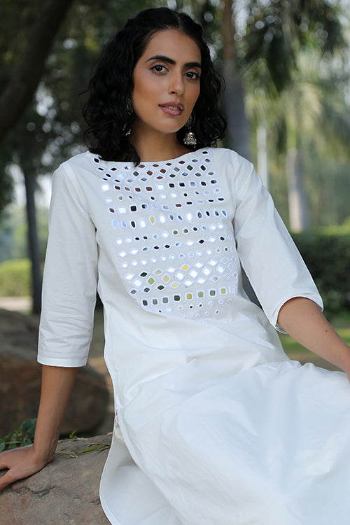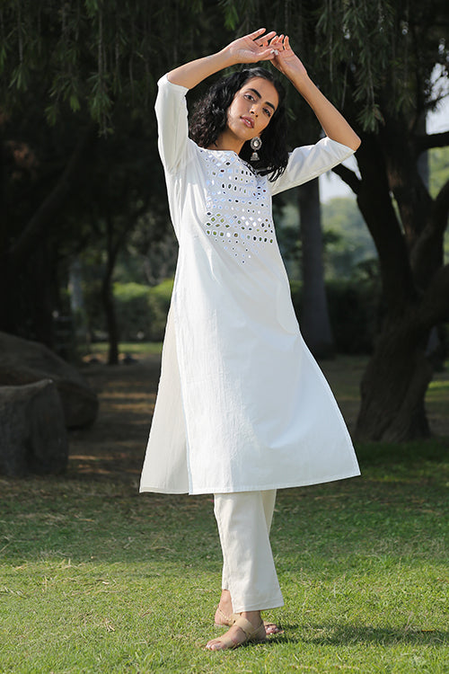 The long kurta is beautifully adorned with mirrors of all shapes, round, square, almond, kite in a self-coloured thread on the front yoke, making it heavily embellished and shimmery. It is also provided with an inside shoulder loop for a strap with press buttons for supreme comfort and fit. The kurta also feature two spacious pockets on both the sides. Pair it with white pants to ace a monochromatic classic look or with contrasting coloured pants for a day event!