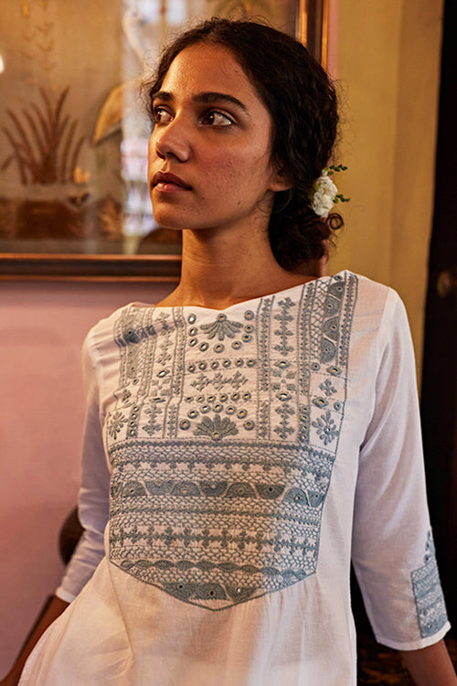 A timeless piece in white is our ‘Glacier’ long kurta. Feel the ultimate handcrafted love when you wear this superb piece of clothing. Made from pure cotton fabric, the kurta is provided with two pockets to make your life easy. This beauty is generously embroidered in many different motifs and further elevated with mirror work. The sleeves also see some detailed hand embroidery. Team it with palazzos or cigarette pants, this lovely kurta will carry you through the day with grace.
