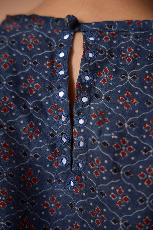 Give yourself a royal treatment by decking yourself up in the tunes of our “Opal Ballad” Kurta Pant Set. Handcrafted from pure Chanderi Silk blue fabric, the kurta, with its haltered neckline forming a small triangle shape in the front, flatters your shoulders. Alluring to the eyes and soothing to the skin, the kurta is lined with pure Mul fabric underneath. Mirrors hand-embroidered at specific intervals on the front neck keyhole glimmer in the light, catching the eye. At the back, there’s a loop and button for the neck opening and a back closure slit. Equipped with 2 pockets on the sides, one small mirror each is embellished on both pockets’ ends on the kurta. Contrasting the kurta harmoniously are the maroon pants, which come with Mul lining below. It is elasticated at the back with a zipper on the left side. Wrap the vibrant maroon Kota Doria Dupatta around you as we gracefully step into the festival season!