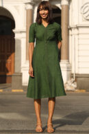 Epitome of femininity is our ‘Parakeet’ in a beautiful forest green colour. Crafted from pure cotton fabric and with a silhouette so cool, this dress will flatter you from all angles. This piece has a classic V-neck easy for accessorising and two pockets for your essentials. The wooden buttons lined along the functional placket are a great highlight. The soft gathers along the waist will ensure a shapely look. Get this sensational piece before it sells out!