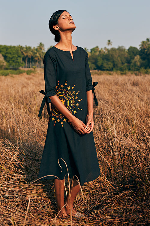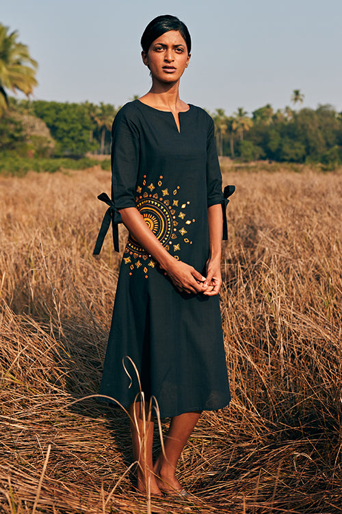 A gorgeous piece of clothing such as our ‘Power’ cannot be missed. Handcrafted with attention in pure cotton fabric, this anti-fit one-piece boasts stunning embroidery on one side. It might be all black, but you will be the source of brightness with the giant Sun-like design in orange and yellow. Embroidered in various stitches, the eye-catchy artwork is also bedecked in mirrors of different shapes. Give it a spin and reveal the full motif going around the waist. Most times, less is more, but sometimes, more is just what you need! You get one pocket and the cuffs have an adorable detail where little bows can be tied. Put on a choker with a statement pendant that sits perfectly in the V of the neckline!