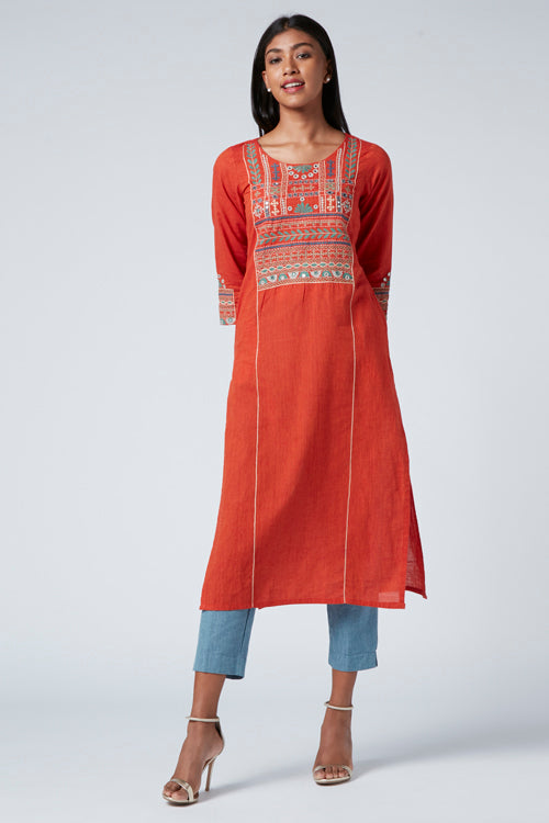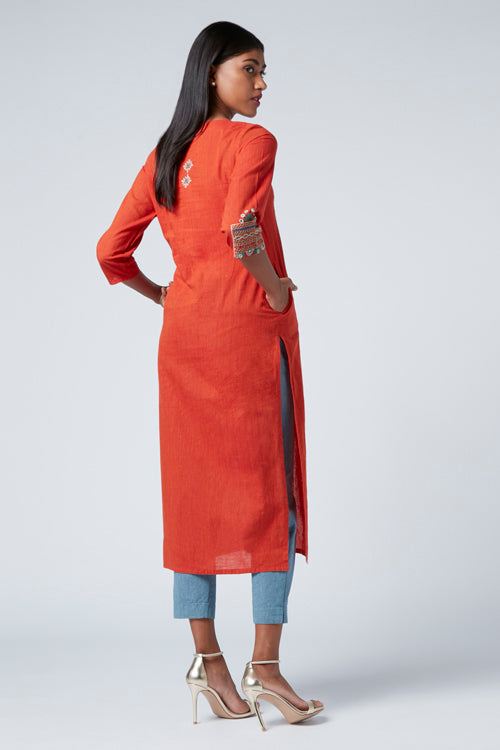 A vibrant orange coloured cotton fabric crafted into an exquisite kurta adorned with a variety of hand embroidered motifs to give it a truly heritage look. A timeless classic, this design can be styled for work, festive occasions and family functions. Pair it with gold or jewel tones for a glamorous evening look, or keep it simple with neutrals. Complete with pockets for your essentials, this is one for the albums.