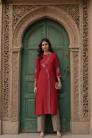 Unique, stunning and a statement piece of a design, this exquisite Okhai outfit is made from vibrant Cotton Handloom and adorned with intricate hand embroidery and mirror work, on the front, sleeves and back. One of a kind, this design can be styled both as a dress and as a kurta. Wear it for special occasions and festivities, pairing it with your favourite accessories, Stay stylish and comfortable in this design,which even has pockets for your essentials.