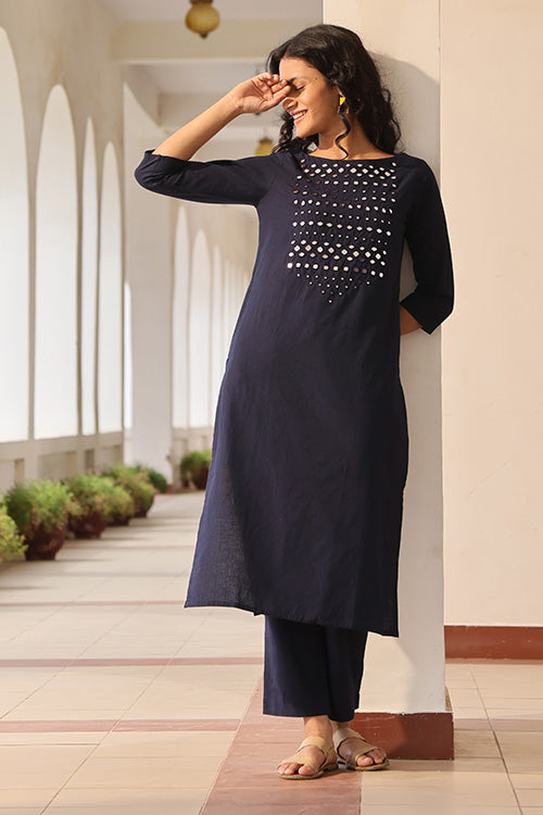 Minimal and Smart. Illuminate every moment as you don this elegant kurta. With its square,round, diagonal, and almond-shaped mirrors on the front yoke resembling the star-studded night sky, the kurta catches the light and everyone’s attention. It comes equipped with two slits on the sides. Handcrafted from pure cotton fabric, this is an elegant yet comfortable kurta for all occasions. Go for a casual look by pairing it with blue jeans during the day. Or look effortlessly chic in the evening by pairing it with light neutral pants. And the cherry on the top? It comes with two pockets!