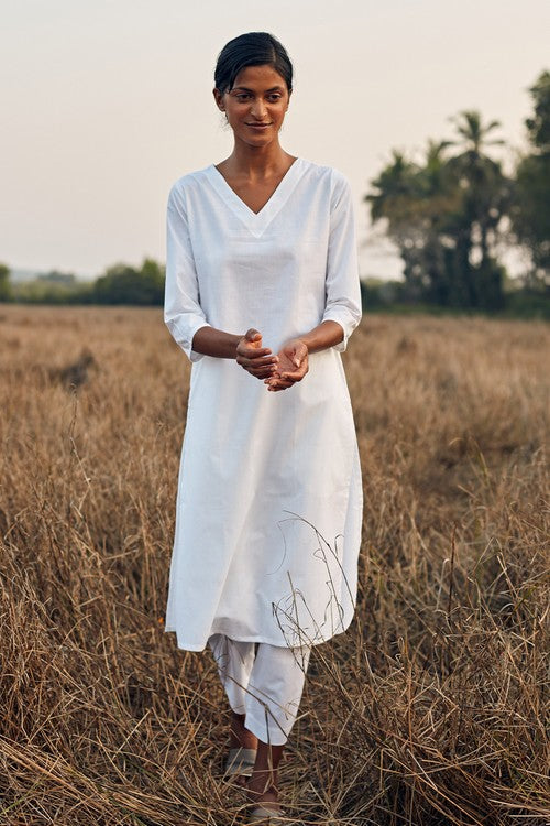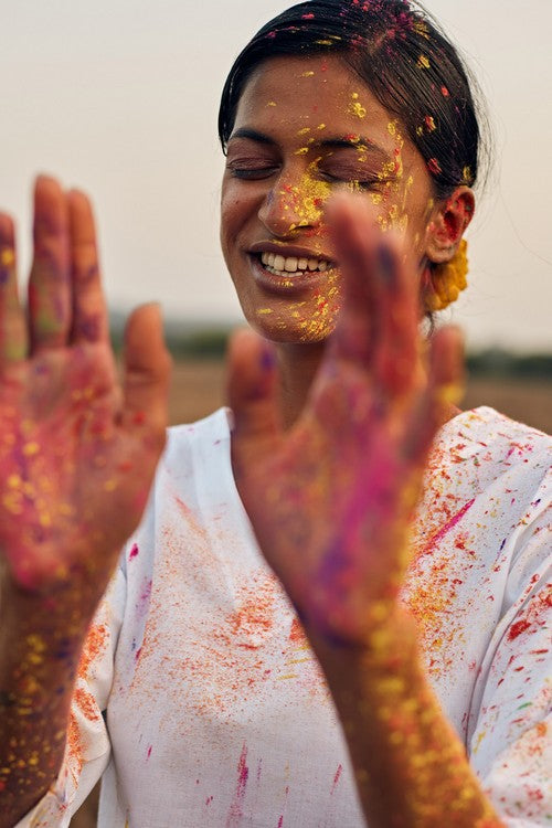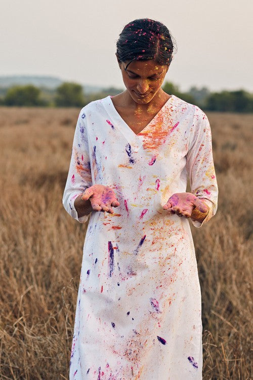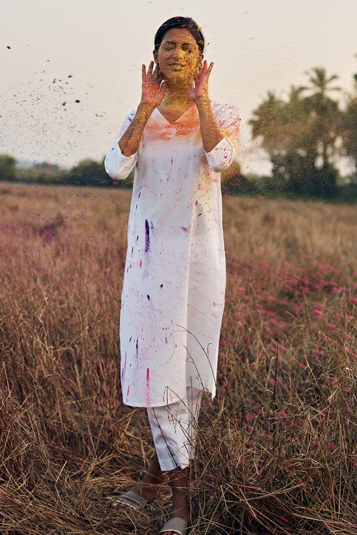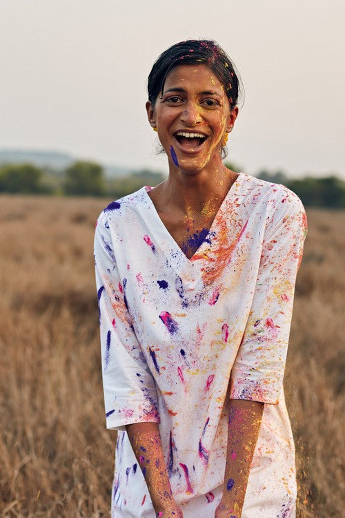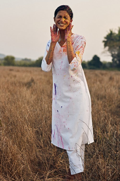 Giving you an all-white ensemble for Holi with our ‘Snow White’ kurta-pant set. Handcrafted in pure cotton fabric, the kurta has a classic V-neck and two pockets. The pant has a straight cut for a contemporary appeal and also has two pockets. Switch the pants for a long skirt and you have yourself another look. Mix and match with other items in your wardrobe and create unique looks each time. The best thing about all-white outfits is that you can pair any colour dupatta with it. Take your pick from the wide range of dupattas from Okhai!