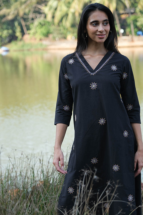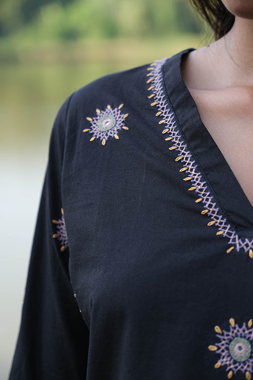 A jet black kurta with as much class as our ‘Songful’ is a wardrobe essential. Crafted from pure cotton fabric, it’s packing all its character around the neckline. The bold V-neck is decked with intricate embroidery accentuating your collar bone, delicate embroidery stitches such as chain stitch, laisy-daisy and double herring bone stitches round the mirror all over in front and round the sleeves makes it minimal yet sophisticated kurta a must-have. style it as a festive look paired with ornate jewellery and dupatta or keep it sleek with neutrals and minimal accessories. Pair it with jeans or palazzos for a casual ethnic look or with pencil-fit pants as workwear. Your choice!