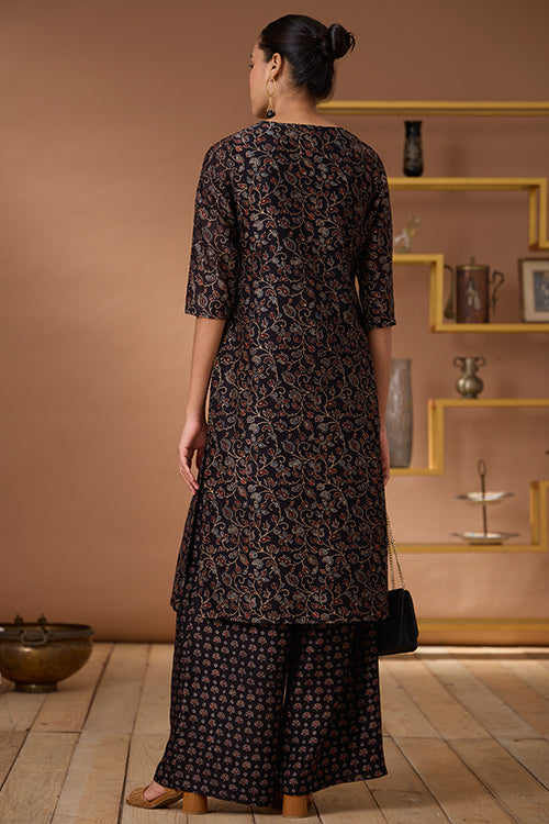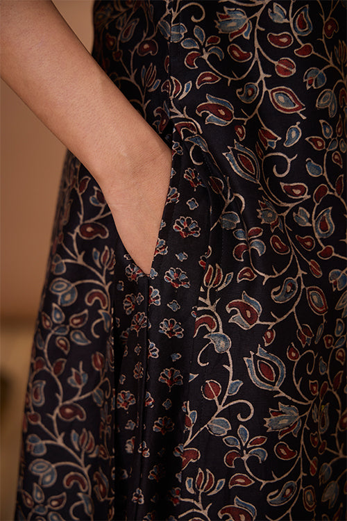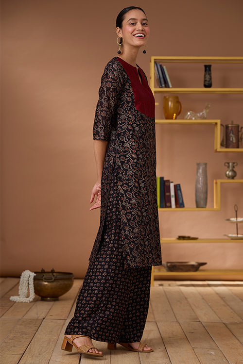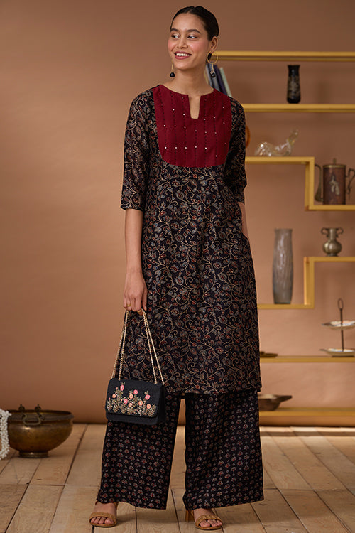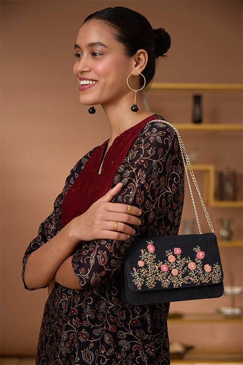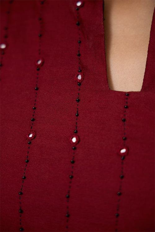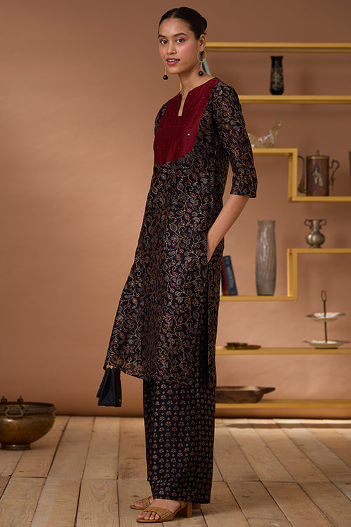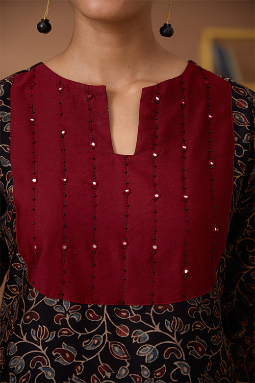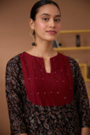 A marvellous play of colours, textures and old craft tales, presenting to you our “Starburst” Chanderi Silk Kurta. This kurta comes with the classic regal sheen of Chanderi Silk fabric, paired with the comfort of Mul lining (excluding the sleeves) underneath it. With the black bodice boasting Ajrakh printed blooms, the maroon red yoke is a piece of art with hand-embroidered black thread lines running vertically and black beads and mirrors adorned at intervals. It has shoulder loops with press buttons and 2 slits for free movement. And yes, it has pockets for your essentials too! It’s your turn to be divine this festive season so add this beauty to your wardrobe.
